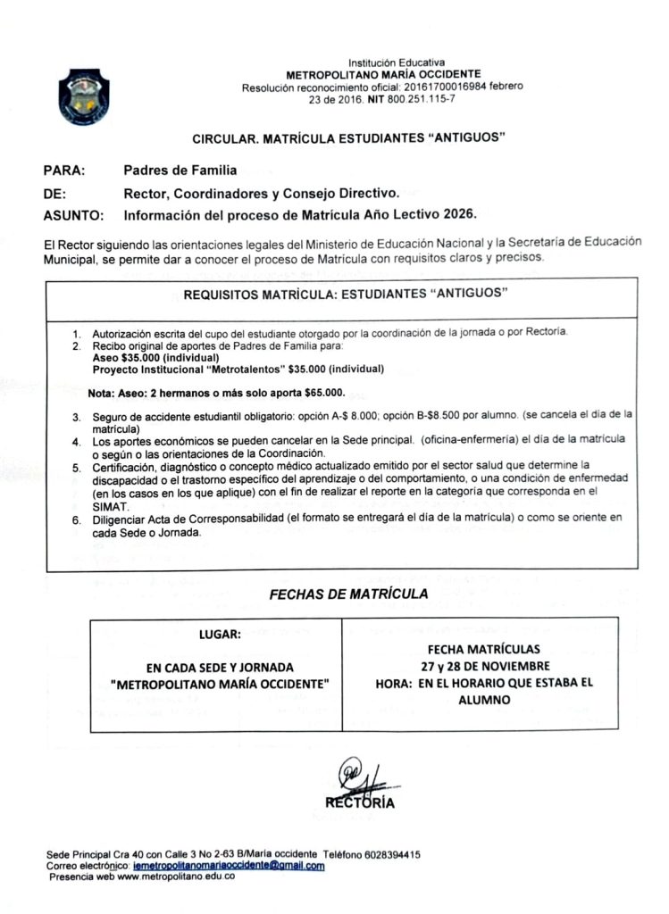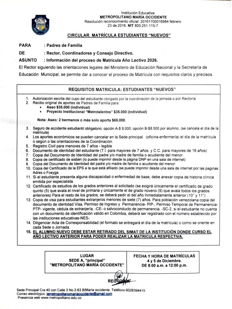 SISTEMA DE EXCUSAS JORNADA MAÑANA SEDE A Noticias Matrícula Estudiantes Antiguos Matrícula Estudiantes Nuevos Cronograma de finalización 2025 Galería de videos y fotografías Metrotalentos Sede Lomas de Granada Izada de bandera 2024